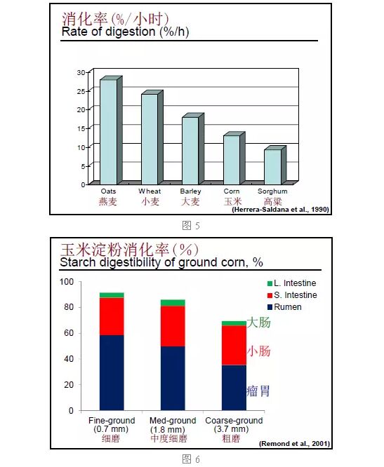瘤胃消化率 和玉米比起來,大麥的瘤胃消化速度更快一些,除了谷物的不同種類以外(圖5),不同的加工方式也會影響精料在瘤胃中發(fā)酵的速度和程度。