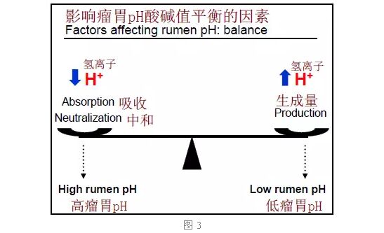 我們在調(diào)配奶牛營養(yǎng)時,常??紤]到底喂多少精料、喂多少粗料,精料會不會導致瘤胃過酸等問題。根據(jù)我的理念,并不是配方里的精粗比影響了瘤胃的酸度。如圖3,在瘤胃里,如果氫離子濃度很高,天平就會往右下壓,pH值就會很低。日糧粗料里,不是一定要喂幾公斤的草或比例達到多少才可以調(diào)控瘤胃pH值,主要是因為吃粗料奶牛的反芻會增加,唾液會變多,而唾液是最好的緩沖鹽,瘤胃緩沖能力增加,氫離子濃度減少,瘤胃pH值就會提高(中和一些)。但實際上,日糧中不是中洗纖維(NDF)設定多少就能確保瘤胃pH值并不會過酸,而是要根據(jù)瘤胃當中氫離子濃度來定。