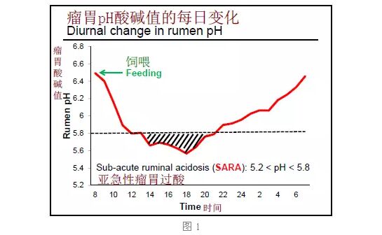 如圖1,這是一頭泌乳奶牛每天飼喂以后用儀器測出來的瘤胃酸堿值的變化。早上八點飼喂之后,大家可以看到pH值下降到5.8以下,可能還會繼續(xù)往下或上升一點。再過幾小時后, pH值慢慢上升,在下一次飼喂之前,pH值回到飼喂之前的水平。