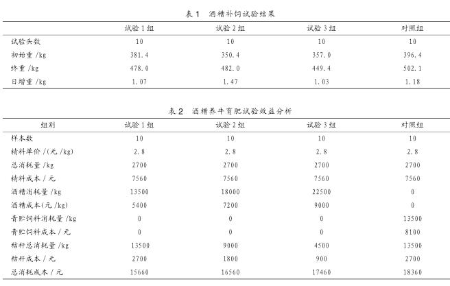 試驗(yàn)期3個月。對照組按照養(yǎng)殖場原飼養(yǎng)方式飼養(yǎng),不得補(bǔ)飼精料;育肥組單獨(dú)組群,除按照原方式飼養(yǎng)外,補(bǔ)飼發(fā)放的精料,日補(bǔ)飼精料量不超過牛只體重的1.5%(以預(yù)試期的實(shí)際補(bǔ)飼量為準(zhǔn)),每日記錄育肥組精料采食總量和酒糟量,同時記錄青粗飼料量。每個月末,同時測定對照組和育肥組空腹體重。根據(jù)體重,確定下個月育肥組的精料日補(bǔ)飼量(以采食干凈為準(zhǔn)),做好記錄。