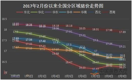 圖2 2017年2月份以來全國分區(qū)域豬價(jià)走勢圖