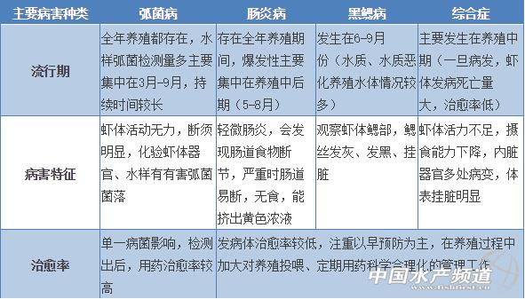 進入2016年以來,隨著小龍蝦全國養(yǎng)殖區(qū)域不斷增加,小龍蝦精養(yǎng)、蝦蟹混養(yǎng)、稻田養(yǎng)蝦、蝦藕共作、魚蝦混養(yǎng)等養(yǎng)殖模式多樣化,也給我們養(yǎng)殖帶了諸多病害問題;在這多樣化的養(yǎng)殖模式下,其主要病害以弧菌病,黑鰓病,腸炎病以及綜合征為主,見表1。