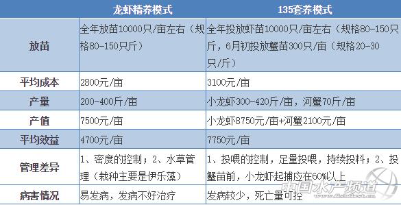 表2小龍蝦精養(yǎng)模式和“135”套養(yǎng)模式的差異