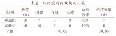 (2)仔豬的治療效果分析。試驗(yàn)組仔豬治療的總有效率為100%(16/16),治療天數(shù)平均為6天;對(duì)照組仔豬治療的總有效率為80%(12/15),治療天數(shù)平均為7天,療效對(duì)比有統(tǒng)計(jì)學(xué)意義,結(jié)果詳見表2。