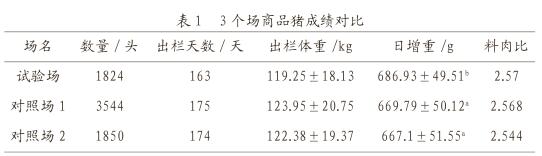 跟蹤三個試驗場數(shù)據(jù),并統(tǒng)計分析可以得出:試驗場一共追蹤1824頭商品豬生長性能成績,比對場分別追蹤3544頭、1850頭商品豬生長性能成績,對比發(fā)現(xiàn)料肉比沒有明顯差異;試驗場日增重顯著高于其他兩個對比場(P<0.05);在飼養(yǎng)出欄天數(shù)少11-12天的情況下,出欄體重僅僅低4kg左右(表1)。由此可見,優(yōu)秀公豬豬精配種后代的生長速度明顯高于對比場。在出欄體重(120kg)相同的情況下可降低出欄天數(shù)5-6天。因此采用優(yōu)秀種公豬配種可快速改善后代生長性能,提高生長速度,由此可降低出欄天數(shù),節(jié)約生產(chǎn)成本,為養(yǎng)殖場創(chuàng)造巨大的經(jīng)濟效益。