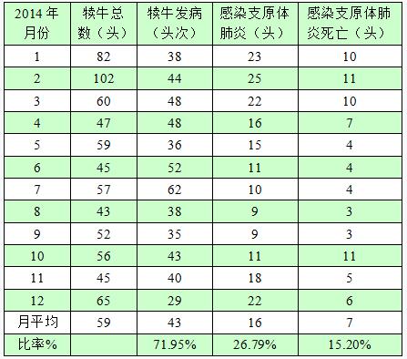 2014年牛場犢牛支原體肺炎發(fā)病率,特別是兩月齡內(nèi)的犢牛發(fā)病率較高,影響了犢牛的生長,對牛場2014年的牛群增長、繁殖都有一定影響,犢牛支原體肺炎發(fā)病率高達27%,死亡率高達14%,根據(jù)目前牛場情況結(jié)合往年牛場數(shù)據(jù)顯示,犢牛死亡率最低為5%,針對這種情況,牛場成立QC小組,針對犢牛支原體肺炎的發(fā)病率高、死亡率高的問題進行QC活動,降低犢牛的發(fā)病率及死亡率。對2014年牛場犢牛支原體的發(fā)病情況進行了調(diào)查統(tǒng)計,見下表。