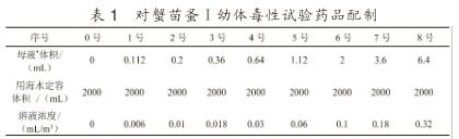 (3)試驗(yàn)步驟。準(zhǔn)備試驗(yàn)藥品、試驗(yàn)動(dòng)物、試驗(yàn)用水及試驗(yàn)儀器。試驗(yàn)動(dòng)物現(xiàn)采現(xiàn)用,或者提前兩天采集。 試驗(yàn)前用小燒杯進(jìn)行挑選,每個(gè)燒杯10只。投放時(shí)先用該毒液迅速潤洗2~3次后帶水一并投入。兩種藥品對蟹苗蚤Ⅰ幼體的毒性試驗(yàn),濃度梯度范圍選為0.0056~0.32mL/m3,具體設(shè)置見表1。將挑選的10個(gè)同時(shí)期產(chǎn)出的蟹苗蚤Ⅰ幼體按要求放入。每一濃度梯度設(shè)3個(gè)平行,定時(shí)進(jìn)行觀察。