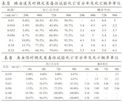 通過預(yù)試驗(yàn),得到濃度區(qū)間為0.002~0.2mL/m3,即24小時(shí)橈足類全部死亡的最小濃度梯度和96小時(shí)橈足類全部死亡的最高濃度梯度之間的范圍。根據(jù)預(yù)試驗(yàn)結(jié)果,選擇在0.002~0.2mL/m3之間設(shè)置6個(gè)梯度、7個(gè)濃度,分別為0.010、0.018、0.032、0.056、0.100、0.180和0.320(單位:mL/m3),進(jìn)行正式試驗(yàn)。將得到的死亡數(shù)進(jìn)行平均,求出死亡百分率,查表得到相應(yīng)的死亡概率單位,如表5、表6。