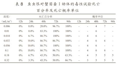 (2)兩種藥品對蟹苗蚤Ⅰ幼體的毒性試驗(yàn)。配制實(shí)驗(yàn)溶液,進(jìn)行對蟹苗蚤Ⅰ幼體毒性試驗(yàn)。將得到的死亡數(shù)進(jìn)行平均,求出死亡百分率,查表得到相應(yīng)的死亡概率單位,如表7、表8。