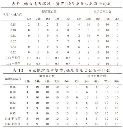 (3)驗(yàn)證試驗(yàn)。綜合對橈足類和蟹苗蚤狀幼體的毒性試驗(yàn)結(jié)果,選擇 0.180mL/m3和0.320mL/m3兩個(gè)濃度用蚤Ⅳ進(jìn)行驗(yàn)證試驗(yàn)。實(shí)驗(yàn)結(jié)果表明,在均能殺滅橈足類的同時(shí),蛛蟲速滅對蟹苗的傷害比魚蟲恨的程度小,數(shù)據(jù)如表9和表10。