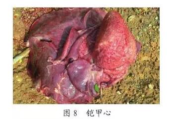 關(guān)節(jié)型鏈球菌腕關(guān)節(jié)發(fā)病居多(圖7),關(guān)節(jié)腔積液是化膿型,比較濃稠,色澤深。關(guān)節(jié)腫大,初期堅(jiān)硬、溫度升高,后期變軟,觸之有波動感,針刺流膿,有時(shí)傷口破潰后膿汁會自動流出;少數(shù)變硬、皮膚增厚;剖檢滑液渾濁,有黃白色奶酪樣塊狀物,關(guān)節(jié)周圍皮下膠樣水腫,有化膿性壞死灶,嚴(yán)重者關(guān)節(jié)軟骨壞死。