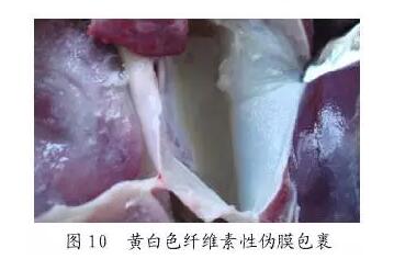 腹腔有明顯的纖維素性滲出,常出現(xiàn)腹腔臟器與腹膜粘連,嚴(yán)重的剖開腹腔后看不見腹腔臟器,整個腹腔勝器被黃白色纖維素性偽膜包裹(見圖9、圖10),并且腹水嚴(yán)重,伴發(fā)怪臭味。