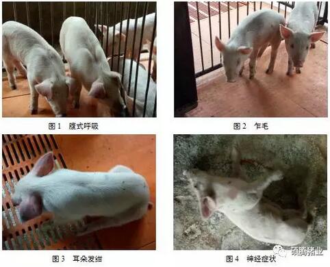 從2016年8月份起該場(chǎng)母豬、小豬的藍(lán)耳疫苗更換成了國(guó)內(nèi)某廠家的江西毒株藍(lán)耳疫苗。8月份豬場(chǎng)還比較穩(wěn)定,到了9月下旬,由于氣候變化,氣溫突然下降,該場(chǎng)斷奶1星期左右的保育豬開(kāi)始出現(xiàn)體溫升高、腹式呼吸、乍毛、耳朵發(fā)紺、神經(jīng)癥狀等臨床表現(xiàn)(圖1~圖4),后來(lái)保育后期、育肥前期的豬也出現(xiàn)類似癥狀,保育死淘率超過(guò)8%,育肥死淘率也超過(guò)3%。