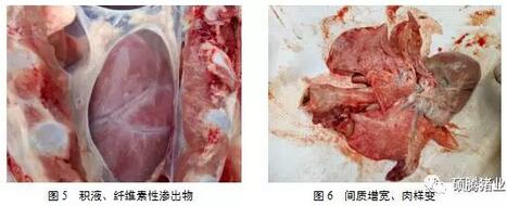 剖檢變化主要表現(xiàn)為胸腔積液、有纖維素性滲出物,肺部間質(zhì)增寬、肉樣變等(圖5、圖6)。