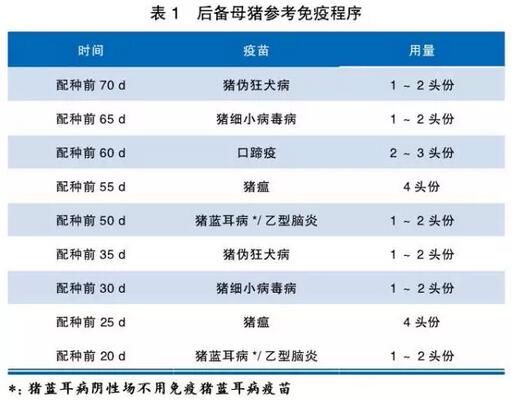 就當(dāng)前我國(guó)養(yǎng)豬業(yè)的實(shí)際情況來(lái)說(shuō),免疫仍是豬場(chǎng)疫病防控的重要手段,后備母豬的免疫更是容不得半點(diǎn)疏忽。后備母豬的疫苗免疫一定要立足本場(chǎng)實(shí)際情況,并非防的越多越好,切不可照抄照搬其他場(chǎng)的免疫程序。其中豬瘟、豬口蹄疫、豬細(xì)小病毒病、豬偽狂犬病、豬乙型腦炎為強(qiáng)制免疫病種,所留后備豬必須進(jìn)行免疫;豬藍(lán)耳病、豬圓環(huán)病毒病應(yīng)根據(jù)本場(chǎng)實(shí)際情況決定是否免疫。后備母豬參考免疫程序如表1。