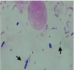 無(wú)菌采集病變部位的肺臟組織,染色后,觀察到疑似兩種細(xì)菌,一種為革蘭氏陽(yáng)性、單個(gè)或短鏈球菌,另外一種為革蘭氏陰性短桿菌或個(gè)別稍長(zhǎng)桿菌(圖3)。