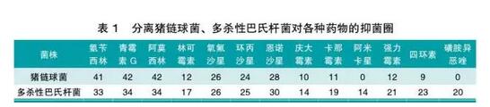 根據(jù)養(yǎng)殖戶反映,使用氟苯尼考、替米考星、強(qiáng)力霉素等藥物,療效不佳,筆者推測(cè)豬群感染耐藥性菌株所致。因此,分離豬鏈球菌和多殺性巴氏桿菌,進(jìn)行藥物敏感試驗(yàn),結(jié)果顯示,氨芐西林、阿莫西林、青霉素、恩諾沙星、環(huán)丙沙星等藥物敏感。