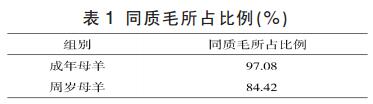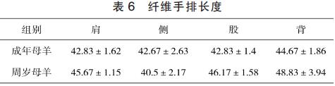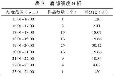 (1)羊毛纖維類型。本次調(diào)查的大尾寒羊因經(jīng)過改良,被毛同質(zhì)性較好,所測的83只羊中,成年母羊同質(zhì)毛所占比例為97.08%,周歲母羊同質(zhì)毛所占比例為84.42%。所有羊只肩側(cè)全部是同質(zhì)毛,因此本次分析對象主要以同質(zhì)毛為主。