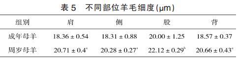(3)不同部位的羊毛細度。表5顯示,部位間毛細度有一定的差異。成年羊和周歲母羊都是股部的毛較其它部位的長和粗,周歲母羊股部與肩、側(cè)、背之間的差異均顯著(P<0.05)。另據(jù)相關(guān)報道,中衛(wèi)成年山羊的羊絨按肩、側(cè)、股順序依次變粗。肩、股部相差0.42μm。內(nèi)蒙古白絨山羊按腹、肩、頸、背、體側(cè)、股順序依次變粗,腹、股部相差0.48μm,差異不顯著??梢?,部位間羊絨細度是有一定差異的。但有的明顯有的不明顯,這和品種、飼養(yǎng)環(huán)境等都有一定關(guān)系。年齡對羊絨細度也有明顯的影響,羔羊時期羊絨最細,以后隨年齡增大羊絨變粗,4~5歲時羊絨達到最粗,以后隨年齡增大又逐漸變細。