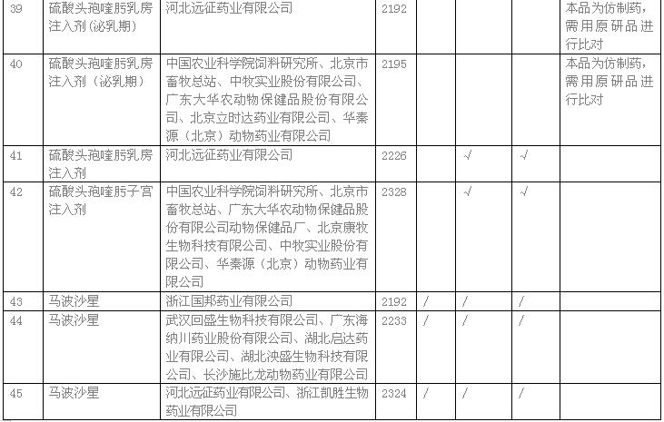5、相應(yīng)欄中“√”的,表示開(kāi)展相應(yīng)的試驗(yàn);相應(yīng)欄中打“/”的,表示不需要開(kāi)展比對(duì)試驗(yàn)。無(wú)合法原料的,表示無(wú)原料質(zhì)量標(biāo)準(zhǔn),不能開(kāi)展比對(duì)試驗(yàn),按新獸藥注冊(cè)。