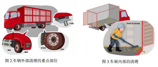 1.2.3 車廂是否有滲漏、遺撒等情況,及時清理、收集滲漏、遺撒物,調(diào)整或增加防止?jié)B漏、遺撒的設(shè)施,對局部進行清洗、消毒。