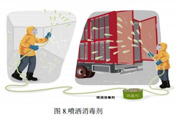 4.1.1 拆除廂壁及隨車攜帶的隔離板或隔離柵欄等物品沖洗干凈后,用過氧乙酸或漂白粉溶液噴霧消毒,或在密閉房間內(nèi)熏蒸消毒。
