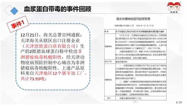 事件2:2018年12月21日,海關(guān)總署官網(wǎng)通報(bào):天津海關(guān)從轄區(qū)出口注冊(cè)企業(yè)(天津恩彼蛋白質(zhì)有限公司)生產(chǎn)的2批豬血球蛋白粉中檢出非洲豬瘟病毒核酸陽(yáng)性,經(jīng)天津動(dòng)物疫病預(yù)防控制中心確診為非洲豬瘟病毒核酸陽(yáng)性。上述產(chǎn)品原料來(lái)自天津地區(qū)12個(gè)屠宰加工廠,共計(jì)73.93噸。