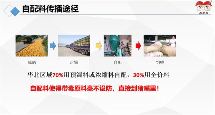 華北區(qū)域70%用預(yù)混料或濃縮料自配,30%用全價(jià)料,玉米沒(méi)有經(jīng)過(guò)高溫?zé)o法殺死病毒,自配料使得帶毒原料毫不設(shè)防,直接到豬嘴里,感染非瘟的幾率極大。