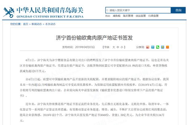 4月1日,濟寧海關(guān)為濟寧櫻源食品有限公司出口的烤鴨簽發(fā)了濟寧市首份輸歐盟禽肉原產(chǎn)地證書,這也是青島關(guān)區(qū)首份輸歐禽肉原產(chǎn)地證書。憑借這份原產(chǎn)地證書,該批貨物到歐盟后可享受配額內(nèi)10.9%的進口關(guān)稅,單票貨物稅款減免超過6萬美元。