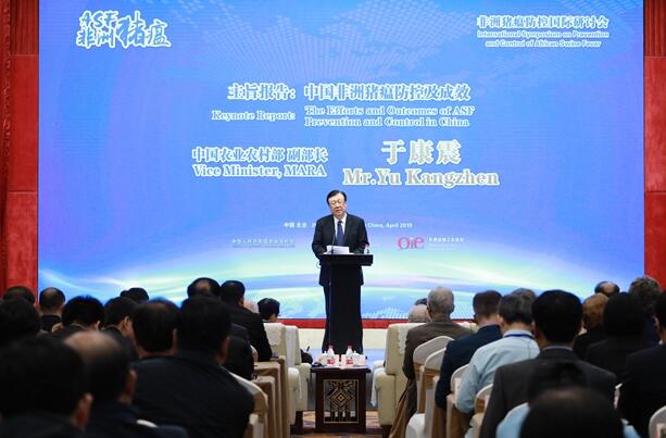 4月9日,由中國農(nóng)業(yè)農(nóng)村部與聯(lián)合國糧農(nóng)組織(FAO)、世界動(dòng)物衛(wèi)生組織(OIE)共同舉辦的非洲豬瘟防控國際研討會(huì)在京舉行。與會(huì)代表就疫情監(jiān)測(cè)預(yù)警、疫情根除和疫苗研發(fā)進(jìn)展等議題開展了廣泛交流,就加強(qiáng)防控合作,共同防范和化解非洲豬瘟帶來的風(fēng)險(xiǎn)進(jìn)行了深入探討。農(nóng)業(yè)農(nóng)村部部長(zhǎng)韓長(zhǎng)賦、OIE總干事艾略特和FAO助理總干事提詹尼等出席會(huì)議并致辭。
