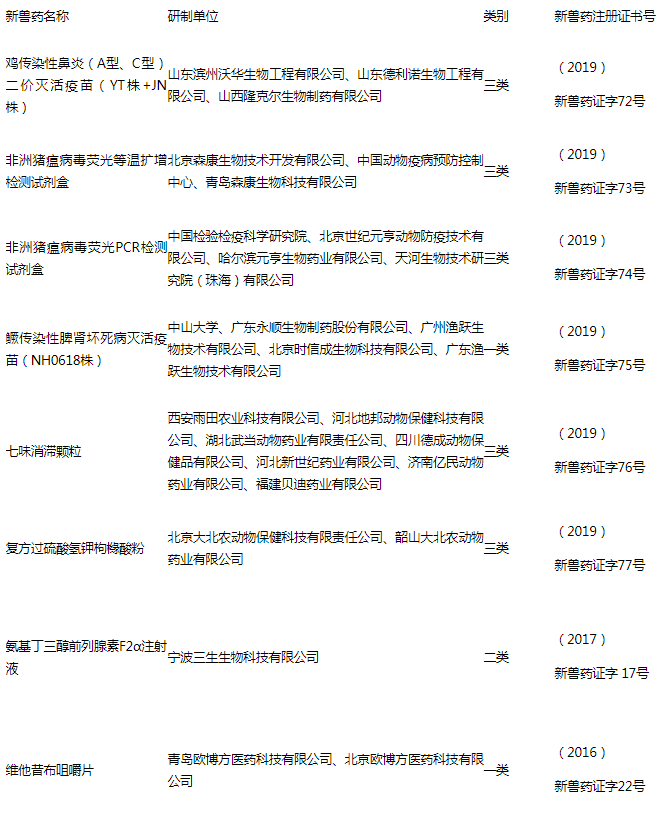 批準(zhǔn)寧波三生生物科技有限公司等3家單位申報(bào)的氨基丁三醇前列腺素F2α注射液等2種獸藥產(chǎn)品變更注冊(cè),發(fā)布修訂后的氨基丁三醇前列腺素F2α注射液質(zhì)量標(biāo)準(zhǔn)、說(shuō)明書(shū)和標(biāo)簽,自發(fā)布之日起執(zhí)行,原我部發(fā)布的該產(chǎn)品質(zhì)量標(biāo)準(zhǔn)、說(shuō)明書(shū)和標(biāo)簽同時(shí)廢止;發(fā)布修訂后的維他昔布咀嚼片質(zhì)量標(biāo)準(zhǔn)、說(shuō)明書(shū)和標(biāo)簽,自發(fā)布之日起執(zhí)行,新增靶動(dòng)物貓監(jiān)測(cè)期5年。