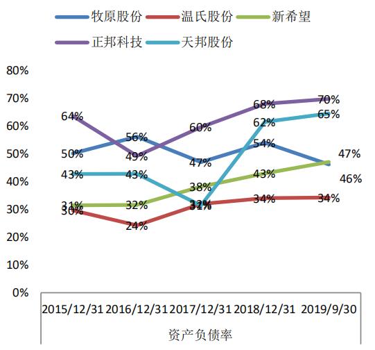 除了溫氏股份外,其他大型豬企的負(fù)債率均超過了50%,償債壓力并不小,繼續(xù)發(fā)力養(yǎng)豬業(yè)務(wù)的負(fù)擔(dān)會更重。例如去年上半年牧原股份資產(chǎn)負(fù)債率為57.01%,整體負(fù)債合計達178.42億元,其中流動負(fù)債為151.1億元大于流動資產(chǎn)金額。同時,2018年11月,牧原股份公布的50億定增計劃中,擬募集15億資金用以償還債務(wù)。正邦科技資產(chǎn)負(fù)債率為67.48%,較上年末降低0.54個百分點, 2019年半年度虧損2.5億-2.8億;天邦股份資產(chǎn)負(fù)債率為66.64%,2019年第一季度負(fù)債合計41.14億元。