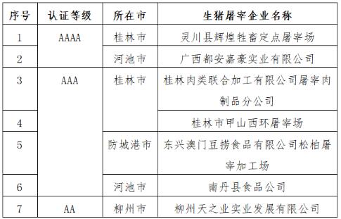 廣西第四批生豬屠宰企業(yè)分級認(rèn)證名單