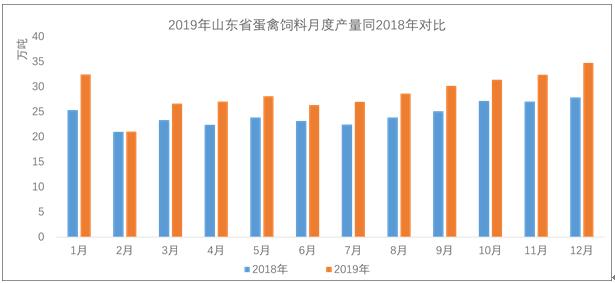 圖4 2019年山東省蛋禽飼料月度產(chǎn)量同2018年對比