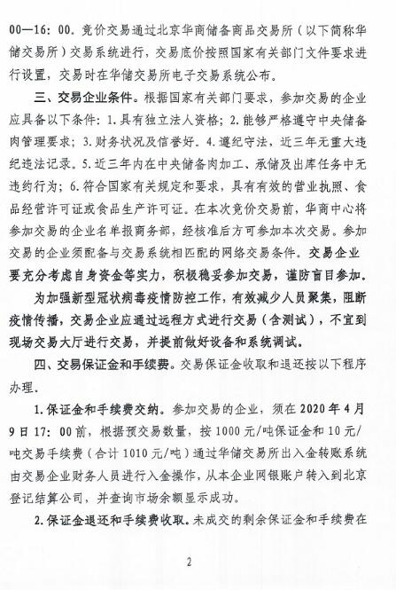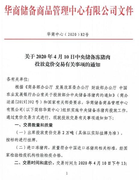 華儲網(wǎng)4月8日發(fā)布中央儲備凍豬肉投放競價交易有關(guān)事項的通知,將競價交易2萬噸,交易時間為2020年4月10日下午13時至16時,這是今年以來第14批投放的中央儲備凍豬肉,累計投放量將達(dá)29萬噸。