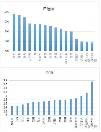 料肉比來看,西班牙、巴西、荷蘭排名前三,均低于2.5。在FCR這個(gè)指標(biāo)上,巴西反超美國,看來巴西不光足球踢得好,養(yǎng)豬水平也絲毫不含糊。