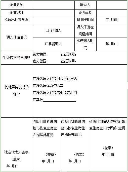 在種豬調(diào)出時(shí),調(diào)出的企業(yè)需填寫《跨省調(diào)出種豬備案表》,并提交相關(guān)佐證材料,向省動物衛(wèi)生監(jiān)督所申請調(diào)運(yùn)相應(yīng)數(shù)量豬只。