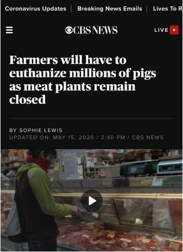 △美國(guó)哥倫比亞廣播公司:由于肉類(lèi)加工廠關(guān)閉,養(yǎng)殖戶將不得不對(duì)數(shù)百萬(wàn)頭生豬實(shí)施安樂(lè)死。