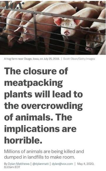 △美國(guó)新聞評(píng)論網(wǎng)站VOX:肉類(lèi)加工廠關(guān)閉導(dǎo)致活體禽畜大量積壓,后果不堪設(shè)想。