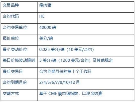 美國(guó)瘦肉豬期貨以“瘦肉豬指數(shù)”為基準(zhǔn),進(jìn)行現(xiàn)金交割,交易單位為40000磅生豬酮體,約等于18噸。報(bào)價(jià)單位為美分/磅,合約月份為2、4、5、6、7、8、10、12月。
