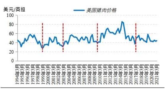 我們使用了美國(guó)1994年以來(lái)的美國(guó)豬肉價(jià)格數(shù)據(jù),該數(shù)據(jù)來(lái)源于美國(guó)農(nóng)業(yè)部季度價(jià)格數(shù)據(jù)。根據(jù)實(shí)際價(jià)格表現(xiàn)粗略推演,自1994年以來(lái),美國(guó)生豬產(chǎn)業(yè)已經(jīng)經(jīng)歷了4次完整的豬周期。總體來(lái)看,美國(guó)豬周期隨時(shí)間推移有拉長(zhǎng)趨勢(shì)。