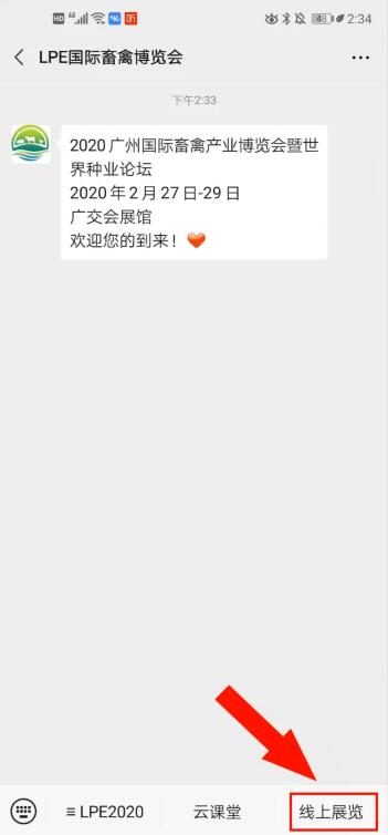 進(jìn)入線上展覽的方式2:關(guān)注LPE2020微信公眾號(hào)(LPE國際畜禽博覽會(huì))——點(diǎn)擊“線上展覽”進(jìn)入瀏覽頁面