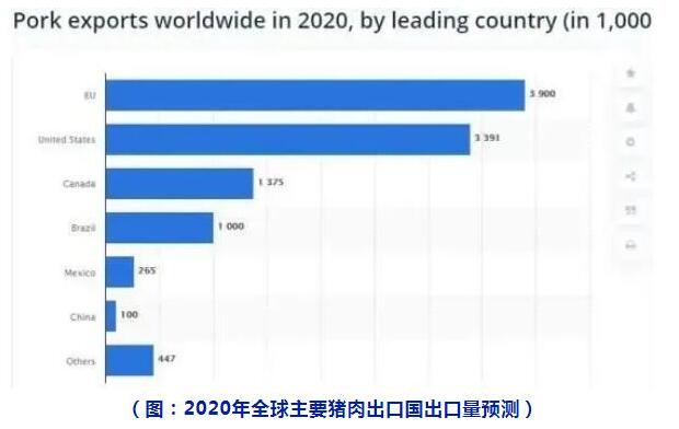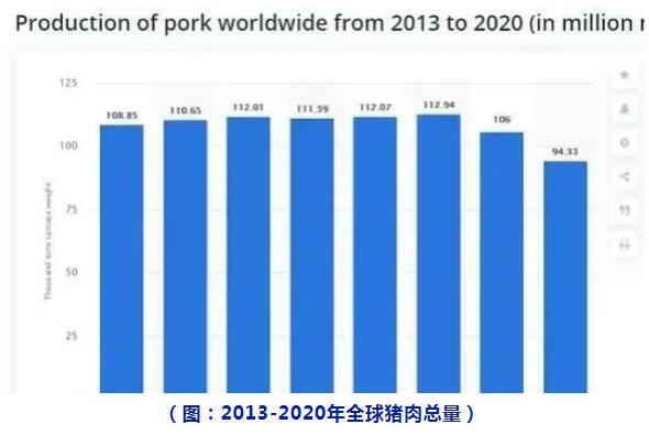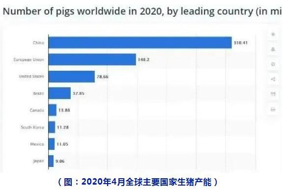 根據(jù)STATISTA數(shù)據(jù)公布統(tǒng)計,截至2020年4月,中國擁有3.1億頭生豬,歐盟有1.48億頭,美國有0.78億頭,占據(jù)世界前三位。目前全球生豬總量約為6.67億頭豬,相比2019年同期的7.76億頭下降了約1.1億頭。