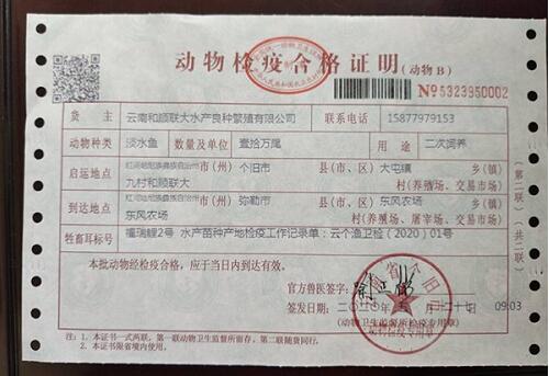 漁業(yè)官方獸醫(yī)通過群體觀測、魚體解剖、顯微鏡觀察等魚類疫病診斷方法對福瑞鯉苗種完成現(xiàn)場檢疫后,將《水產(chǎn)苗種產(chǎn)地檢疫工作記錄單》報個舊市動物衛(wèi)生監(jiān)督所,運用動物檢疫合格證明電子出證系統(tǒng)出具了紅河州第一本水產(chǎn)苗種產(chǎn)地檢疫合格證。這標志著紅河州水產(chǎn)苗種產(chǎn)地檢疫工作正式啟動,今后將進入常態(tài)化監(jiān)管。