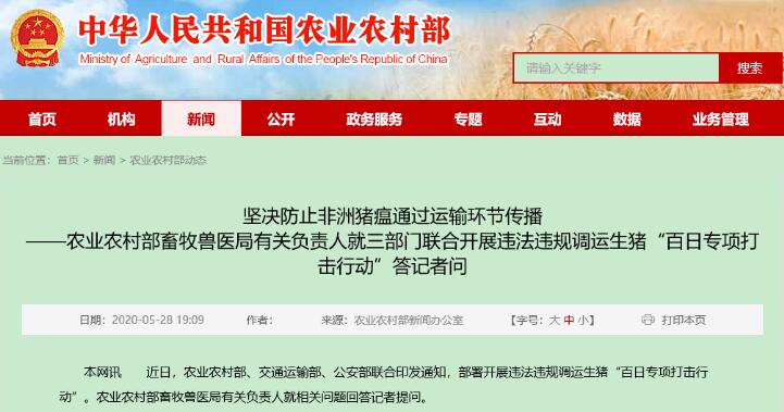 為有效控制非洲豬瘟跨區(qū)域傳播風(fēng)險(xiǎn),農(nóng)業(yè)農(nóng)村部從4月初開始,已經(jīng)開展了為期60天的違法違規(guī)調(diào)運(yùn)生豬專項(xiàng)整治行動(dòng),取得了階段性的積極成效。這次農(nóng)業(yè)農(nóng)村部、交通運(yùn)輸部、公安部決定共同行動(dòng),把專項(xiàng)整治升級為“百日專項(xiàng)打擊行動(dòng)”,就是要通過更加廣泛深入地查辦違法違規(guī)調(diào)運(yùn)行為,更加有力地防控風(fēng)險(xiǎn)。通過開展這次“百日專項(xiàng)打擊行動(dòng)”,將推動(dòng)在全國范圍內(nèi)建立起多部門協(xié)作的生豬調(diào)運(yùn)監(jiān)管工作機(jī)制,織密以省界、重要樞紐及縣域內(nèi)高速公路出入口為重點(diǎn)的監(jiān)管網(wǎng)絡(luò),健全固定站點(diǎn)檢查與流動(dòng)巡查相結(jié)合的監(jiān)管模式,形成有效防范非洲豬瘟等重大動(dòng)物疫病通過運(yùn)輸環(huán)節(jié)傳播的長效機(jī)制。