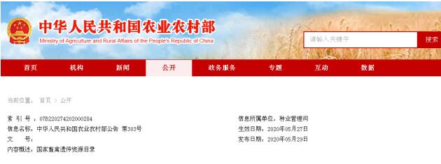 中華人民共和國(guó)農(nóng)業(yè)農(nóng)村部公告 第303號(hào)