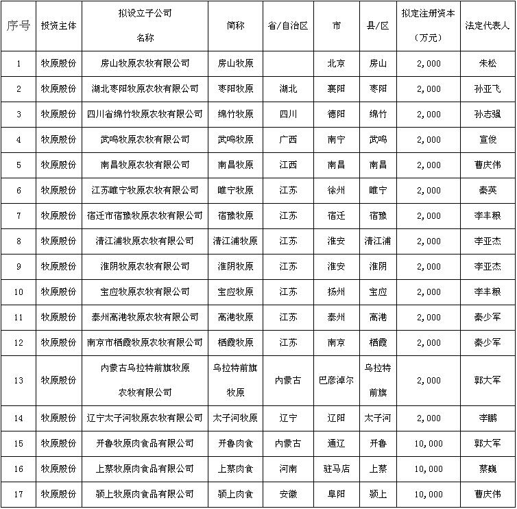 隨著公司養(yǎng)殖規(guī)模的逐步擴(kuò)大,結(jié)合公司戰(zhàn)略發(fā)展需要,公司將進(jìn)一步打造集科研、飼料加工、生豬育種、種豬擴(kuò)繁、商品豬飼養(yǎng)、生豬屠宰為一體的生豬產(chǎn)業(yè)鏈。公司在北京市房山區(qū)、湖北省襄陽(yáng)市棗陽(yáng)市、四川省德陽(yáng)市綿竹市、廣西壯族自治區(qū)南寧市武鳴縣、江西省南昌市南昌縣等14個(gè)地區(qū)設(shè)立子公司開(kāi)展生豬養(yǎng)殖業(yè)務(wù),有利于公司擴(kuò)大生產(chǎn)規(guī)模,提高公司產(chǎn)品市場(chǎng)占有率,獲取規(guī)模經(jīng)濟(jì)效益,實(shí)現(xiàn)全體股東的利益最大化。