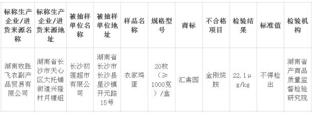 不合格樣品信息顯示,湖南省長(zhǎng)沙初蓮超市有限公司銷售的、標(biāo)稱湖南牧勝飛農(nóng)副產(chǎn)品貿(mào)易有限公司生產(chǎn)的農(nóng)家雞蛋,金剛烷胺不符合食品安全國(guó)家標(biāo)準(zhǔn)規(guī)定。檢驗(yàn)機(jī)構(gòu)為湖南省產(chǎn)商品質(zhì)量監(jiān)督檢驗(yàn)研究院。