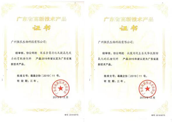 ??目前,廣州傲農(nóng)擁有近五十項(xiàng)有效專利,其中授權(quán)發(fā)明專利十五項(xiàng),先后獲得國家高新技術(shù)企業(yè)、廣東省重點(diǎn)農(nóng)業(yè)龍頭企業(yè)、廣東省創(chuàng)新型企業(yè)、廣東省名牌產(chǎn)品、廣州市制造業(yè)骨干企業(yè)、廣東省飼料百強(qiáng)企業(yè)等榮譽(yù)稱號,并且連續(xù)兩年獲評廣州市專利技術(shù)產(chǎn)業(yè)化項(xiàng)目,分別為2018年度廣州市專利技術(shù)產(chǎn)業(yè)化項(xiàng)目(重點(diǎn)項(xiàng)目)——“提高免疫功能的豬用飼料產(chǎn)業(yè)化項(xiàng)目”,2019年度廣州市高價(jià)值專利培育項(xiàng)目——“改善腸道健康的豬飼料產(chǎn)業(yè)化項(xiàng)目”,擁有自主研發(fā)的“抗腹瀉促生長及降低脂肪氧化的乳豬飼料”“促采食易消化及提高免疫力的育肥豬飼料”“抗熱應(yīng)激與縮短母豬產(chǎn)程提高生產(chǎn)性能的妊娠母豬飼料”等7件高新技術(shù)產(chǎn)品。