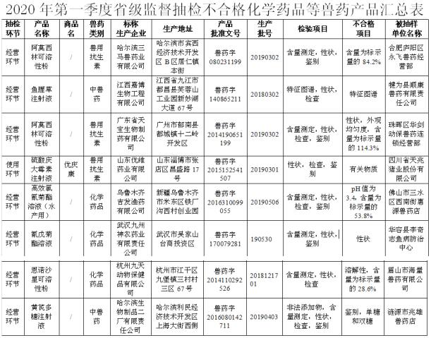 附件:1. 2020年第一季度省級(jí)監(jiān)督抽檢不合格化學(xué)藥品等獸藥產(chǎn)品匯總表